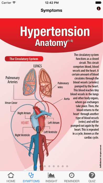 The Signs & Symptoms Hypertension helps the patients to self-manage Hypertension using interactive tools. This app gives the patient important information regarding signs and symptoms of Hypertension and management of the disease. This app also allows the patient to record and track Hypertension levels along time with an incredible graphing option. The patient can show these records to the doctor and together improve the patient’s quality of life. Besides, the user can test its knowledge regarding Hypertension in an amusing way through a little and funny quiz. Some information provided may not be valid for residents of other countries due to variations in medical practice and drug approval and indications. This patient education application provides patients and Health Care Practitioners with easy to access information on Hypertension management. Created by Built by Doctors World.