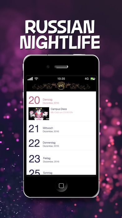 Die Mobile Event App: russischen Diskotheken und Musik. Immer dabei! Die beliebtesten Diskos mit aktuelle Nachrichten über Partys.