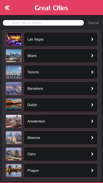 * Universal compact app for iPhone 6 / iPhone 6 Plus / iPhone 5 / iPhone / iPod / iPad These are the greatest places for a city break anywhere in the world. These are the cities you must enjoy visiting. Highlights: • Visitor Info • History • Climate • Gallery • Local Attractions • Hotels • Travel tips • How to get there • Culture • Recreation • Things to do Etc… √ Latest information about 100 Great Cities of the World. √ GPS facility is enabled to show the directions and route map. √ Beautiful image gallery with lots of images. Let’s enjoy more photos. √ POI Search - POI Search available. (Bars, Restaurants, ATM's, Lodges, Hospitals, Airports, Railway Stations, Drug Stores, Traveling Agencies Etc). √ Translator - Supports 52 languages, Large text Translation. √ World Clock - All major cities of the world (1000 Cities).
