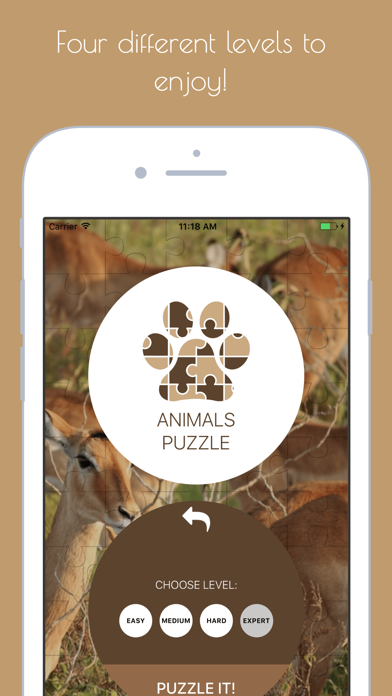 Welcome to Animals Puzzle, the best animals jigsaw puzzle game on the App Store. It is awesome to make a puzzle with the images of your favourite animals. Do a relaxed puzzle or play an exciting game if you prefer. You can choose from easy level (great for kids) to expert level (if you feel really inspired). Have a lot of fun and don't forget to share your puzzles and invite your friends and their kids to play! Features: - Infinite puzzles! Stop waiting for new puzzle bundles or paying for bad zoo images. Build your jigsaws from our amazing list of wild and domestic animals and just play in your favourite game mode. - Explore all the amazing photos and play with your friends or children. - Astonishing quality images leads to amazing puzzles. You can zoom in and out all the pieces to get a more detailed look. You just have to enjoy the journey of doing it. We care about the rest. - Preview full screen photo while doing the jigsaw available. Don’t worry about forgetting how the photo was, you can always preview the full image. FOUR DIFFERENT GAME LEVELS: Easy (4 to 9 pieces) Have a lot of fun with your kids and let them play this easy level with their favourite animal photo. Kids love challenges. But having fun is essential. Let them play this easy level and they will have a lot of fun while training their little brains for bigger things. Medium (9 to 20 pieces) Don’t get impressed by the numbers. With some practice you and your kids can play easily this jigsaw level. Hard (20 to 50 pieces) This is not for everyone. With the correct amount of focus and practice you will build animals puzzles from this level with ease. Play it back and forth to achieve the super ability of puzzle maker. Expert (more than 50) Completing one puzzle of this level will give you a boost of confidence and happiness. Doing a bunch of this expert level jigsaw puzzles will make you a master. Choose the cutest animal photo and play! TWO DIFFERENT GAME MODES: - Take a coffee and just RELAX. This mode will let you do the jigsaw at your own pace. Pick your favourite animal photo and start a new puzzle game to play. You can pause the game, save it and play it later. - Or better let’s play and exciting GAME. This game mode is amazing. Do your animal puzzles before the time catches you. You have to play smart. There are 10 levels to beat (for now) and each one solved will decrease the amount of time you have to solve the jigsaw. Extra focus and agility required. You won’t have time to hesitate. So challenge all your friends and people you know to an exciting animals puzzle competition sharing your results to Facebook and Instagram and inviting them to play. You and your kids will have so much fun. We are so excited with this game. Play it with your friends, family, kids or on your own. Children love jigsaws! It’s a perfect way to entertain yourself while commuting and in many different daily situations. Don’t let your friends beat you at the Expert level and play a little everyday to become more confident with your movements. And don’t forget to share every puzzle you do to Facebook and Instagram. The final puzzle is rendered with a super stylish picture frame!! How many jigsaw animals puzzles have you tried and just uninstall because of the poor image quality? This is imposible in Animals Puzzle. You choose the photo from our special images list to build the jigsaw!! We hope you all enjoy Animals Puzzle, the best jigsaw puzzle game on the App Store. It is awesome to make a puzzle with the images of your favourite animals.