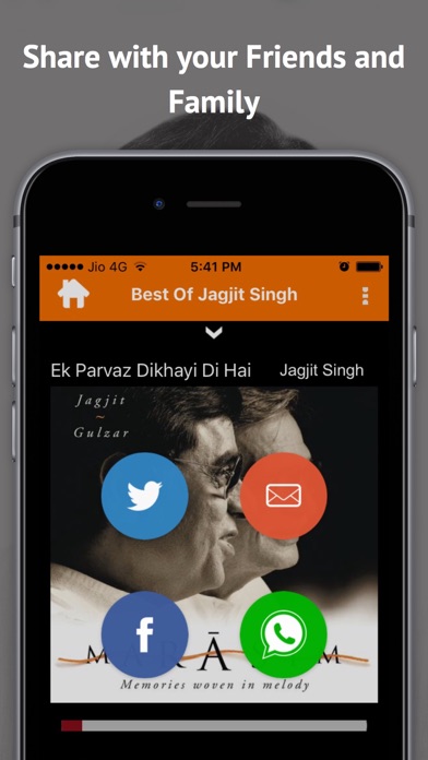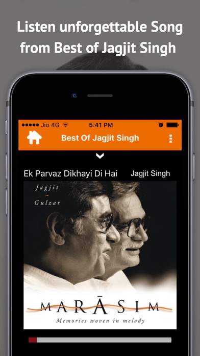 Install the FREE Top 50 Jagjit Singh Songs app and get immersed into a heart-warming music experience. “Someone Somewhere is always listening to the unforgettable, inimitable Jagjit Singh! My job is to ensure that the legend lives on.”– Chitra Singh . Rare recordings performed by Jagjit Singh & featured in this album are a part of his musical journey and have remained unreleased over the last two decades.These have now been personally curated by Chitra Singh, restored and digitally re-mastered. Lets Experience / retain the magic of Jagjit Singh’s voice. Connect with Sony Music Entertainment Like us on Facebook - https://www.facebook.com/SonyMusicIndia Follow us on Twitter - https://twitter.com/sonymusicindia Google+ - https://plus.google.com/+SonyMusicIndia/posts Exclusive HD Videos on VEVO – https://www.youtube.com/user/sonymusicindiaVEVO Support: We would love for you to rate us positively on the App store please. It won't even take 30 seconds & will go a long way in helping us build better apps for you. Love Us? Like Us ?? Then Rate Us In case of any issues, reach us on , send feedback: [email protected]. All content available on this application is legitimate and duly licensed by Sony Music Entertainment India Pvt Ltd. All rights reserved.