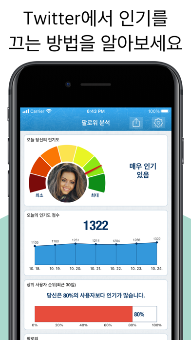 Twitter 프로필을 분석하여 이 앱은 여러분의 팬이 누구인지 또한 여러분에 대한 이들의 관심도를 보여줍니다. ***** 특징 ***** • 순위 차트: 상위 팬 20명의 사진, 순위 및 빠른 명세를 살펴보고 Twitter에서 최신 정보를 유지하세요. • 팬 매트릭스: 상위 팬 20명의 사진이 들어있는 멋진 콜라주를 만들어 냅니다. • 팔로워 분석: Twitter에서 팔로워를 추적하고 인기를 끄는 방법을 알아보세요. • 트윗을기 가장 좋은 시간: 최고의 트윗 시간을 알아보세요. ***** 구독 ***** 구매 결정 시 회원님의 iTunes 계정으로 금액이 청구됩니다. 정기 구독 서비스는 자동으로 갱신됩니다. 자동 갱신을 원하지 않으시면 기간 만료 최소 24시간 전에 자동 갱신 기능을 취소해 주십시오. 정기 구독 서비스 기간 만료 24시간 이내 회원님의 계좌로 갱신 금액이 청구됩니다. 구매 후 회원님의 계좌 설정에서 정기 구독 서비스 및 자동 갱신을 관리하실 수 있습니다 (https://support.apple.com/HT202039). 정기 구독 서비스 기간 중에는 정기 구독 서비스를 해지하실 수 없습니다. 무료 체험 기간 동안 정기 구독 서비스를 신청하셨다면 사용하지 않으신 무료 체험 기간은 사라집니다. 가격은 언제든 변동될 수 있지만, 제품의 구매 가격은 주문이 확정된 시점을 기준으로 부과됩니다. 개인 정보 보호 정책: https://www.dixapp.com/mytopfollowers-pp 이용 약관: https://www.dixapp.com/mytopfollowers-tos