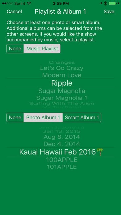Slide Show Soundtrack makes it easy to create a self-running slide show with photos from your device and/or from iCloud. It can optionally include music from a selected iTunes playlist. You select up to five photo albums and a playlist. If you have multiple albums, the program will alternate photos between each group. For example, if you are hosting a graduation party for three people, each one can put his or her photos in a separate album. Slide Show Soundtrack will then alternate between photos of each person. You can also choose whether to randomize the music, randomize the photos, repeat music and photos when all have been used, show a status message of each photo, set the delay between each photo, and the caption of the show. You can pause the show, start it again, skip to the next photo, and go forward and backward within the music playlist. The advertisement at the top of the screen can be permanently removed with an in-app purchase if desired.