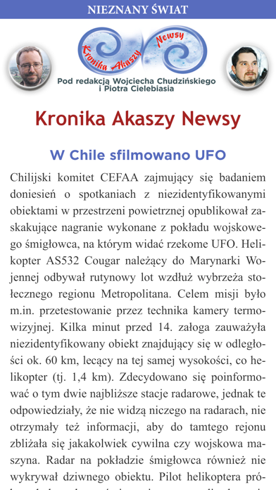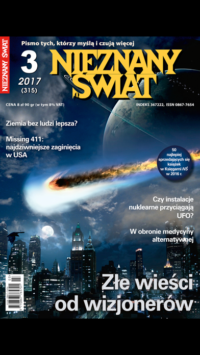 Miesięcznik „Nieznany Świat”, który w październiku 2016 r. obchodził swoje 26-lecie, jest najstarszym polskim tytułem prasowym poświęconym psychotronice, problemom rozwoju duchowego i terapiom naturalnym. Jego próbny numer ukazał się już w 1983 r., jednak ówczesne władze polityczne na wydawanie pisma nie wyraziły zgody, formułując pod adresem jego twórców zarzut, "że zamierzają propagować treści sprzeczne ze światopoglądem materialistycznym". Ostatecznie „Nieznany Świat” wszedł na rynek w 1990 r., ukazując się odtąd regularnie jako miesięcznik w nakładzie +/-80 tysięcy egzemplarzy (aktualny nakład: 70 tys.). W rankingach zagranicznych odnoszących się do rynku prasowego czasopism ezoterycznych „Nieznany Świat” wielokrotnie sytuowano wśród kilku najpoważniejszych, najlepiej redagowanych i najbardziej wiarygodnych tytułów w Europie. Wśród jego blisko stu stałych współpracowników, których nazwiska znajdują się w redakcyjnej stopce, są autorzy z całego świata i niemal wszystkich kontynentów, wśród nich liczni znani dziennikarze oraz badacze. Pismo współpracuje także z kilkunastoma wydawanymi w innych krajach tytułami o podobnym profilu, co umożliwia stałą wymianę interesujących tekstów i bieżący dopływ najciekawszych informacji. Zainstaluj aplikację, pobierz darmowe wydanie "Nieznanego Świata" i sprawdź, jak można w dowolnej chwili, gdziekolwiek jesteś (także offline – poza zasięgiem) czytać „Nieznany Świat” Aplikacja oferuje zakupy: subskrybcji kwartalnej 5,99 euro subskrybcji półrocznej 10,99 euro subskrybcji rocznej 21,99 euro jedno wydanie 1,99 euro Opłata jest pobierana przez iTunes po potwierdzeniu zakupu przez użytkownika Prenumerata odnawia się automatycznie, chyba że użytkownik zrezygnuje z jej przedłużenia, nie później jednak niż 24 godziny przed upływem bieżącego okresu prenumeraty, Opłata za przedłużenie prenumeraty zostanie pobrana z konta użytkownika w ciągu 24 godzin przed upływem bieżącego okresu prenumeraty, zgodnie z aktualnie obowiązującym cennikiem, Użytkownik może sam zarządzać prenumeratą i wyłączyć jej automatyczne przedłużenie za pomocą ustawień w swoim koncie w iTunes ('Manage subscriptions'), Użytkownik nie można zrezygnować z wykupionej prenumeraty, Po zakupie prenumeraty płatnej użytkownik traci możliwość skorzystania z okresu darmowego, jeżeli taki jest w ofercie. Polityka prywatności oraz regulamin korzystania z usług dostępny pod adresem: http://nieznany.pl/pl/i/Polityka-prywatnosci/3 http://e.nieznany.pl/upload/regulamin.pdf