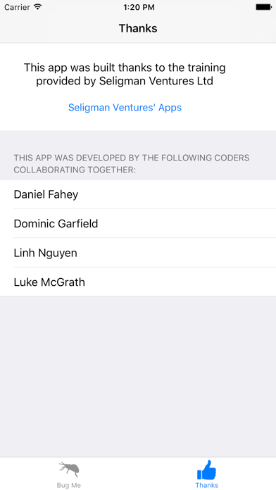 Need a mobile solution for raising bugs. Look no further, introducing: Bug Me A free and easy solution to logging defects on the go. FEATURES ● Create and store bugs on the go ● Email bug lists to anyone in the world ● Simple and clear UI ● Approved & standardised bug format ● Create by a team with over 30 years of testing experience INSTRUCTIONS 1. Simply create a new bug 2. Fill in the relevant optional details 3. Email bug lists to relevant parties THANKS To all the Developers who helped contribute to this app: ● Charlie Seligman ● Dan Fahey ● Dominic Garfield ● Luke McGrath ● Linh Nguyen IMPORTANT Please regularly email the bugs to a valid email as a form of backup. This will mitigate against any loss of data. Please double check email addresses before sending, if communicating sensitive data. LIMITATION OF LIABILITY By downloading this app you are agreeing to the following: You acknowledge that, Seligman Ventures Ltd cannot and does not assume any responsibility for, and shall not be liable for, any damages or expenses you may incur as a result of any inaccuracy, incompleteness or obsolescence of any information or functionality contained in this app. You agree that Seligman Ventures Ltd will not be liable to you or to any other party for any direct or indirect damages, or for any special, exemplary, punitive, incidental, consequential or other damages (including, but not limited to, lost profits or lost time), whether based on contract, tort, strict liability or otherwise, which arise out of or are in any way connected with any access to this app.