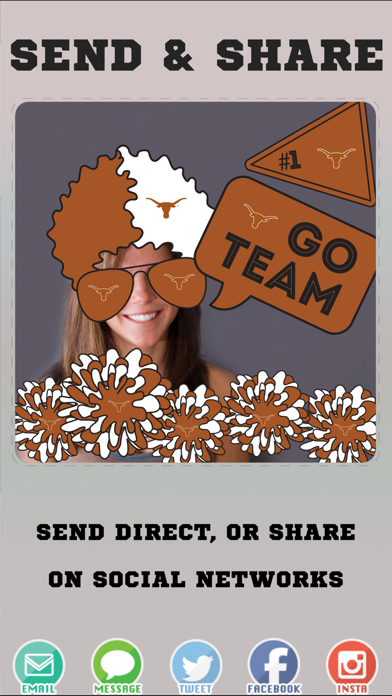 Create, Send and Share University of Texas Longhorn pics on GameDay or any day!!! University of Texas Longhorns Photo Booth Stickers app lets you add awesome licensed University of Texas Longhorns graphics to your selfies and other images. You get 20 University of Texas Longhorns branded stikis that you can express yourself with, including footballs, basketballs, glasses, hats, shirts, foam fingers, hair, helmets and much more. Afterward, share them with your friends through email, messaging, Instagram, Facebook, and Twitter. Become the University of Texas Longhorns fan you were meant to be!!!