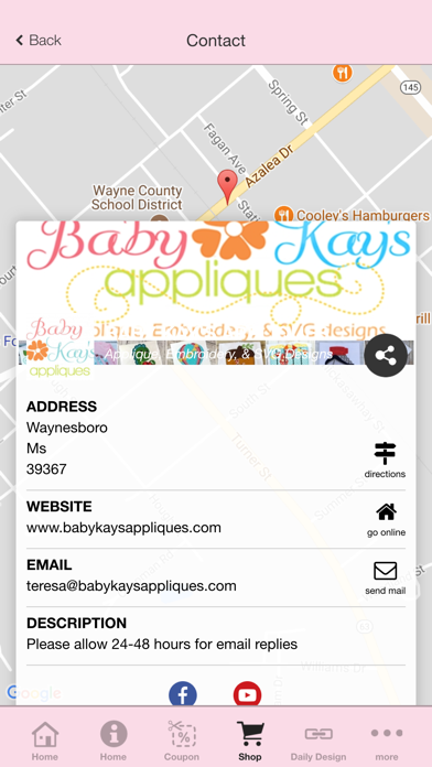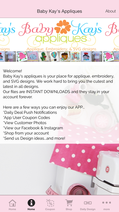 Baby Kay's Appliques has an APP just for you! With our all new App you can do it all right on your phone. *shop with app only coupons *view other customer photos *see our upcoming events *view video tutorials (coming soon), and MORE! Download our App today to start enjoying exclusive deals just for YOU!