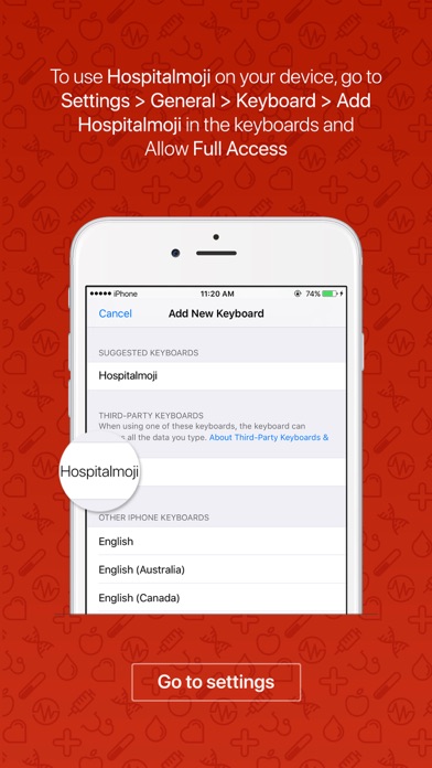 Enjoy 50% OFF for a limited time as a part of the App Store Promotion! Hospitalmoji is the #1 Emoji app for all the doctors, patients, and fitness lovers around the world! Celebrate your everyday life, make your health experience more exciting with Hospitalmoji! Features: • Brilliant high definition graphics, designed for everyone. • iMessage friendly customization. • Ideal for Facebook Messenger app. • Regular updates, new designs with every update. • No hidden charge, pay once and enjoy Hospitalmoji for a lifetime. Keyboard Full Access Clarification: Access must be manually granted after keyboard is added. We DO NOT collect or track any information such as keystrokes or credit card information. We aren't able to view or track what our users type in their keyboard. Allowing full access is simply a technical requirement to be able to paste emojis directly from your keyboard into messaging apps. Follow us on Instagram @knightriders_inc to get instant updates on our apps! Follow us on Facebook for exclusive promo codes and giveaways! Feel free to ask any query on our dedicated Facebook page. We would love to hear from you & appreciate your suggestions.