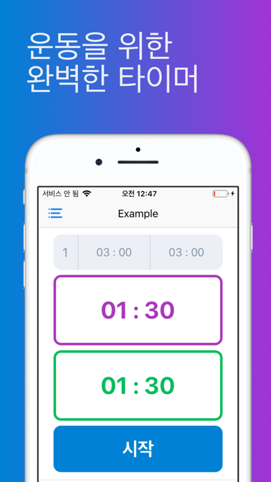 심플하면서 감각적인 타이머앱. 이전까지 많은 Timer 앱에 지치셨나요? 이 앱은 만족감을 드릴 수 있을 겁니다 :) 특징 - 간단한 시작 / 종료 : 메인화면 하단의 버튼을 눌러보세요. 간편하게 시작할 수 있습니다. - 감각적인 디자인 : 심플하면서 세련된 디자인의 메인화면과 함께하세요. - 많은 Timer 목록 관리 : 여러개의 타이머 목록을 생성 할 수 있습니다. 여러개의 목록을 번갈아가며 사용하세요. : 가장 위에 정렬된 항목이 자동으로 메인화면에 선택됩니다. - 디테일한 알림 설정 : 일, 주 주기로 반복 설정이 가능합니다. - 인터벌 운동을 위한 최적의 세팅 : 세트, 운동시간, 쉬는시간을 각각 설정 할 수 있습니다. : 설정한 세트만큼 반복됩니다. - Apple Watch 지원 : Apple Watch 에서도 타이머를 즐기실 수 있습니다. - 다양한 테마 지원 : Original 테마 이외에도 Dark, White 테마를 즐겨보세요 (iOS 10.3 이상 지원) - Health Kit 지원 : 애플의 건강 기능의 칼로리와 연동됩니다.