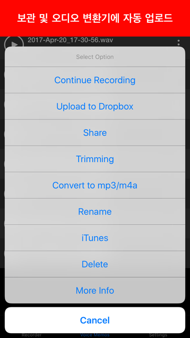 음성 메모는 회의, 강의, 음악 및 더 많은 것을 기록하는 사용하기 쉽고 편리한 응용 프로그램입니다. 이 인터페이스는 빠르게 작동하도록 설계되었습니다. 단일 탭으로 녹음 내용을 녹음하고 공유 할 수 있습니다. 진정한 감정을 지닌 라이브 사운드. 음성 메모로 녹음, 재생 및 오디오 편집을 즐기십시오. 우리는 일상적인 활동에 맞게 조정했습니다. 중요한 일에 참여하고 그것을 기록하고 싶다. 나중에 재생할 수 있도록 음성 메모를 사용하면 코덱 소음 감소 기술을 사용하여 회의, 강의 및 기타 이벤트를 녹음 할 수 있습니다. 당신 주위에 10-100 미터 내에있는 것을 기록 할 수 있습니다. 필요에 따라 녹음을 편집하고 나중에 재생할 수 있도록 저장하십시오. 음성 메모에는 녹음을 듣는 방법을 결정하는 데 도움이되는 여러 가지 재생 옵션이 있습니다. Apple 용으로 특별히 개발 된이 제품은 Apple EarPods와 마찬가지로 뛰어난 성능을 발휘합니다. 자동으로 업로드하고 심지어 클라우드 (Dropbox)에서 몇 초 안에 기록을 공유 할 수 있습니다. 사운드, 녹음, 편집, 재생 및 듣기를 즐기십시오! 기능 목록 오디오 레코더 - 품질 옵션 : (낮음 : 8KHz, 중간 : 22.05KHz, 높음 : 44.1KHz) - 외부 입력 장치 지원 : Bluetooth 마이크, 기타 외부 마이크 (Tascam 마이크로 테스트) - 배경 녹음 지원 - 기존 녹음에 계속 녹음하십시오. - 통화 중단 처리 - 통화 또는 기타 중단 후 녹음이 계속됩니다. 오디오 플레이어 - 빠른 오디오 플레이어 - 재생 제어 (뒤로 빨리 감기, 되감기) - 외부 출력 장치 지원 (Bluetooth 및 외부 스피커 장치) - 배경 오디오 재생 오디오 트리밍 - 녹음 할 부분을 선택하여 잘라냅니다. 나누는 - 이메일 녹음 - 보관 용 계정 공유 (자동 업로드 기록 지원) - iCloud 드라이브에 업로드 - iTunes 파일 공유로 컴퓨터로 녹음 파일 가져 오기 - iOS 및 Mac 기기와 Airdrop 공유. # 범용 앱 - iPhone 및 iPad 장치 모두 지원. # 다른 언어로도 사용할 수 있습니다. 영어, 스페인어, 프랑스어, 독일어, 포르투갈어, 포르투갈어, 이탈리아어, 중문 (简体), Русский, 日本語, 한국어