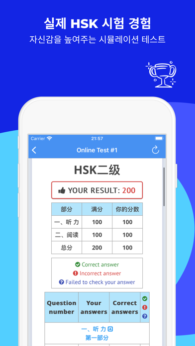 HSK 시험에 자신 있게 준비하세요! 한어수평고시(HSK)는 중국어를 모국어로 사용하지 않는 사람들이 중국어 능력을 증명하기 위한 공식 표준화 시험입니다. HSK 온라인 테스트는 HSK 시험 준비를 위한 최고의 동반자입니다. 초보자부터 고급 사용자까지, 저희 앱은 실제 HSK 시험과 유사한 상호 작용 경험을 제공하여 언어 목표에 한 걸음 더 다가갈 수 있도록 도와줍니다. 왜 HSK 온라인 테스트를 선택해야 할까요? • 실제 HSK 시험 조건을 시뮬레이션한 6개의 모의 테스트 • 인터랙티브한 듣기 섹션 – 공식 시험과 동일한 구조를 경험하세요. • 즉시 결과 – 자동 채점으로 즉시 점수를 확인하세요. • 상세한 분석 – 정답과 비교하여 진행 상황을 추적하세요. • 실제 시간 제한 – 실제 시험처럼 시간 압박 하에서 연습하세요. HSK-2 준비를 위한: • 어휘:필수 단어 300개 • 한자:347자 • 듣기:25분 내 35문제 • 읽기:22분 내 25문제 • 쓰기:이 수준에 포함되지 않음 주요 기능: • 완전한 HSK 테스트 경험을 시뮬레이션하여 자신감을 높입니다. • 진행 상황을 쉽게 추적하고 준비를 조정하세요. • 언제 어디서나, 심지어 오프라인에서도 액세스 가능! 완벽한 이동 중 학습자에게 완벽합니다! 앱이나 테스트에 문제가 있는 경우 앱 내 연락 양식을 통해 쉽게 보고할 수 있으며, 가능한 한 빨리 문제를 해결하기 위해 노력하겠습니다。 더 스마트하게 준비하세요。지금 HSK 온라인 테스트를 다운로드하고 HSK 성공으로 가는 여정을 시작하세요! 출처:http://www.chinesetest.cn