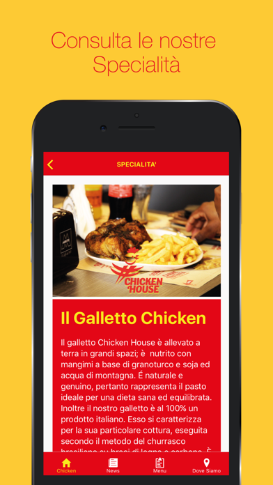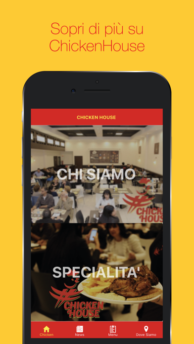 La società Witapp SRL con l'attività ChickenHouse hanno realizzato insieme l'Applicazione Mobile per smartphone e tablet. Tramite l'applicazione è possibile ricevere tutte le informazioni utili riguardanti l'attività ChickenHouse, la loro storia e una descrizione dell'azienda. Inoltre ci saranno diverse News aggiunte di tanto intanto con Eventi e Promozioni valide, ricevendo degli avvisi tramite Notifiche push sui nuovi contenuti. Sarà possibile sfogliare il Menù nel dettaglio con le specifiche sulle specialità della casa, la possibilità di Prenotare direttamente dall'App, aggiungendo al Carrello i piatti desiderati, oppure con il tasto Chiama interagire in maniera diretta con il locale. Infine, tramite il pulsante Naviga ricevere indicazioni da Google Maps per navigare dalla propria posizione fino da ChickenHouse.