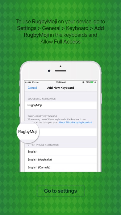 Enjoy 50% OFF for a limited time as a part of the App Store Promotion! RugbyMoji is the #1 Emoji app for all the Rugby union lovers around the world! Celebrate your everyday life, make your conversations more exciting with RugbyMoji! Features: • Brilliant high definition graphics, designed for everyone. • iMessage friendly customization. • Ideal for Facebook Messenger app. • Regular updates, new designs with every update. • No hidden charge, pay once and enjoy RugbyMoji for a lifetime. Keyboard Full Access Clarification: Access must be manually granted after keyboard is added. We DO NOT collect or track any information such as keystrokes or credit card information. We aren't able to view or track what our users type in their keyboard. Allowing full access is simply a technical requirement to be able to paste emojis directly from your keyboard into messaging apps. Follow us on Instagram @knightriders_inc to get instant updates on our apps! Follow us on Facebook for exclusive promo codes and giveaways! Feel free to ask any query on our dedicated Facebook page. We would love to hear from you & appreciate your suggestions. © Copyright 2017 Knightriders Inc. All Rights Reserved.
