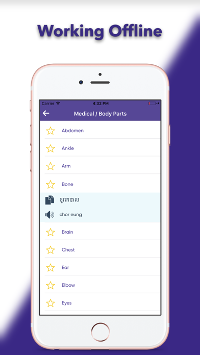 Learn common Khmer phrases and words for travel & live in Cambodia. Features: - Over 2000 phrases and words in 22 categories. - All Khmer phrases and words included transcripts for easy to learn. - All sounds were recorded in high quality by native Khmer speakers. - Can play audio slowly. - Built-in search: you can quickly search phrases in all categories. - Copy, favourite a phrase. - Work offline. List of all categories: 1. Commands, Warnings & Instructions 2. Helpful Words, Phrases, & Questions 3. Greetings / Introductions 4. Interrogation 5. Numbers 6. Days of the Week / Time 7. Directions 8. Locations 9. Descriptions 10. Emergency Terms 11. Food & Sanitation 12. Fuel & Maintenance 13. Medical / General 14. Medical / Body Parts 15. Military Ranks 16. Lodging 17. Occupations 18. Customs (Port of Entry) 19. Relatives 20. Weather 21. General Military 22. Mine Warfare If you like this app and find it useful please take a few seconds to give us a rating in the Apple Store. For comments and suggestions please send an email to [email protected]. We love getting feedback from users of our apps.