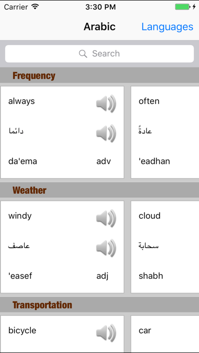 Foreign Language Words And Phrases Learn foreign language is a flashcard program for vocabulary that teaches you efficiently. For a language, this app comes with around 50 cards absolutely free, complete with native and English pronunciation of the words! Try out the app, and if you like how it works, you can upgrade to get over 4500 total words in various categories! There is no fluff, no distractions, just knowledge flowing straight into your brain. Using the dynamic quiz feature, you can fly by stuff you already know and focus on new material. The cards contain the following information: - English word with Foreign translation - The romanization of the foreign word with English letters - AUDIO pronunciation by a native speaker and native English speaker - Part of speech Besides looking at the cards, you can: - Quickly search through a list of words and their translations