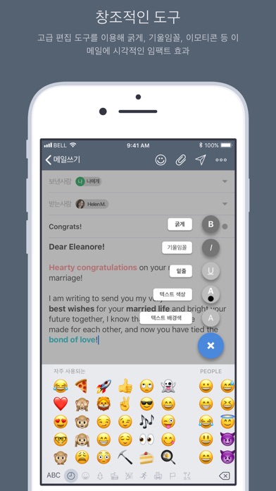 세련된 반응형 디자인을 특징으로 Embratel Mail 이 여러 다른 계정과 기기의 이메일을 읽고 보낼 수 있게 해드립니다. 푸시 알림과 통합 메일함으로 G메일, 야후! 메일, 아웃룩 또는 다른 IMAP 계정의 이메일을 받은메일함 하나에 받을 수 있어 모든 메일을 간단히 쉽게 관리할 수 있습니다. 고급 필터링 및 아바타가 메시지를 우선순으로 분류, 텍스트 편집기 및 이모티콘 메뉴로 메시지 확인이 한 눈에 들어오게 하여 시간을 절약시킬 수 있습니다. 작은 패키지에 강력한 기능들 놀라운 기능의 모던한 이메일 앱이 첨단 모바일 기술과 기능성으로 가득 차있습니다: 선명한 탐색기 - 예쁘고 간편한 디자인이 무엇이 중요한지에 초점을 맞춘 - 이메일. 기능-풍부 - 다른 모바일 앱과는 비교불가한 이용하기에 쉬운 도구 통합 세트로 이메일을 생산성에 최적화하여 효율적으로 관리하세요. 고성능을 위한 최적화 - 미리 로드하기, 캐시, 자동-감지와 같은 스마트한 기능으로 받은메일함의 새로고침 및 더 많은 메시지 로드하기, 주소록 검색이 단 1-2초만에 가능합니다. 모든 계정을 하나로 - G메일과 구글 앱, 아웃룩, 오피스 365, 야후! 메일, AOL, i클라우드 및 기타 IMAP 서버의 모든 이메일을 관리하세요. 통합된 경험 - 모든 계정의 이메일을 통합 메일함으로 합치거나, 또는 계정을 각각 분리하여 보기 하세요. PIM 동기화 - 주소록 및 캘린더를 모바일 기기와 클라우드간에 동기화하세요. 스마트 검색 - 강력한 자동 완성 기능이 있는 검색으로 어떠한 이메일이나 주소록, 첨부파일도 모든 계정에 걸쳐 저장소와 서버 모두에서 빠르고 정확하게 찾아냅니다. 스마트 푸시 알림 - 모바일 기기에 맞춤 작업 설정으로 모든 계정에서 새 이메일이 도착할 때마다 즉각 알림을 받으세요. 소리 및 조용한 시간, 중요도, 특정 발신인이나 특정 폴더를 생활형에 맞게 맞춤 설정하세요. 더욱 빠른 인지를 위해 각 알림에는 발신자명과 발신자 아바타, 첨부파일 여부, 우선도 표시 및 이메일 계정 주소 정보를 포함합니다. 빠른 필터링 - 앱의 간편 필터를 이용해 보기 편한 대로 이메일을 표시하세요. 여러 필터를 이용해 이메일 분류, 자신을 위한 메모 포함; 발신자별; 안읽음; 별표; 첨부파일; 날짜; 기타 조건별로 분류하세요. 스와이프 손동작 - 반응형 디자인의 일부로 맞춤화 가능한 빠른-스와이프 옵션이 받은메일함 관리를 빠르게 만들어 드립니다. 폴더 & 라벨 - 폴더 및 하위 폴더, G메일 라벨을 모두 지원합니다. 받은메일함 비주얼 - 발신자 아바타 기능으로 주소록에 프로필 사진을 추가하면 중요한 사람에게서 온 이메일을 재빨리 찾을 수 있습니다. 이모티콘이 있는 풍부한 텍스트 편집 기능 - 앱의 위지위그 편집기를 이용해 이메일을 한눈에 들어오게 만드세요. 글씨체를 굵게 또는 기울임꼴로; 배경색 또는 글자색; 이모티콘을 추가할 수 있습니다. 다수 계정 - 무제한 수의 사진이나 파일을 첨부하거나, 또는 즐겨찾는 클라우드 서비스 저장소에서 단 몇 번의 탭으로 파일을 첨부하세요. 드롭박스, 박스, 구글 드라이브, 원드라이브, 에버노트, i클라우드 드라이브, 아마존 드라이브가 모두 지원됩니다. 앱 속 지원 - 통합 지원센터에서 도움을 받으세요. 섹션 나누는 방법 및 자주묻는질문, 문제-해결 가이드 등의 각종 팁을 드립니다. 탭 한 번으로 쉽게 도움을 받으세요. 보안 & 개인정보 - 모든 IMAP 연결을 위한 OAuth 2.0 인증 프로토콜과 SSL 암호화의 전적인 지원. 계정 비밀번호의 암호화 강도가 매우 높습니다.