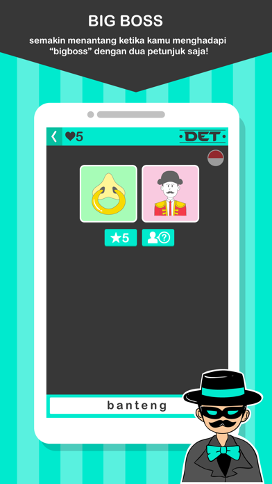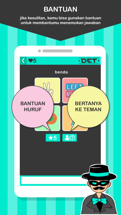 Gawat! Big boss pencuri berhasil menguasai dunia dan banyak terjadi kasus kehilangan. Akhirnya presiden memerintahkan si Det seorang detektif yang cerdas untuk memecahkan misteri ini. Sekarang si Det butuh bantuanmu untuk menyelesaikan misinya lewat permainan ini. - CARA BERMAIN YANG MUDAH - Tidak perlu registrasi dan dengan aturan yang mudah! Langsung main nggak pakai repot! - PENUH DENGAN TEKA-TEKI MISTERI - Kamu mungkin bisa menjawab teka teki yang sulit, tapi apakah kamu bisa menjawab teka-teki misteri? Ayo uji insting detektifmu disini! Cocok banget nih buat ngabuburit bareng teman-teman. - 4 GAMBAR PETUNJUK UNTUK 1 MISTERI - Bukan game 4 pics 1 word biasa, 4 gambar petunjuk akan membuatmu dapat menjawab teka teki misteri ini. Tugasmu adalah menghubungkan 4 gambar petunjuk itu untuk menjawab misterinya! - BINGUNG? PAKAI AJA BANTUANNYA - Jangan menyerah! Kalau kamu bingung pakai saja bantuan untuk membuka huruf atau bisa juga tanya ke teman kamu di sosial media loh, asik kan! - SELFIE BERSAMA SI DET - Ayo ambil foto terbaikmu bareng si Det dan tunjukkan ke teman-temanmu di sosial media kalau kamu juga adalah partner terbaiknya si Det. Yuk langsung aja download game teka teki misteri ini! GRATIS! Mau cari temen main? Yuk gabung aja ke komunitas kita disini : - Facebook : https://www.detplay.com/facebook - Twitter : https://detplay.com/twitter/ - Instagram : https://www.detplay.com/instagram/