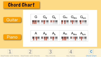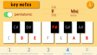 Find Keys, useful for piano and guitar players This app contains the most useful and unique tools for piano and guitar players and song writers. You can easily find the key of your song with chords or notes. FEATURES: • simple user-interface similar to play piano keys • find the next compatible key to your song notes play the notes of your song and see the compatible keys to the notes. • find the next compatible key to your song chords select the chords of your song and see the compatible keys to the chords. • see the chords of a key select the key and see the chords. • see the notes of a key select the key and see the notes. there is a switch to see only the pentatonic notes.