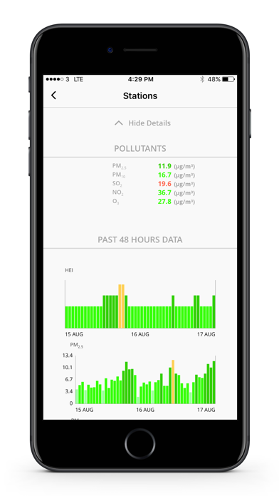 Actual time reporting of the Hedley Environmental Index (HEI) for Hong Kong and/or Shenzhen. HEI is reported on a scale of 1 to 12 and 12+ and grouped into five bands, with low, moderate, high, very high and serious air pollution. Features: • Report air pollutants that exceed the World Health Organization Air Quality Guidelines (WHOAQG) of each air monitoring station (13 urban rooftop and 3 roadside air monitoring stations in Hong Kong, 11 stations in Shenzhen) • Report hourly HEI of each monitoring station • Report air pollutant concentrations of each stations and their past 48-hour trends (PM2.5, PM10, SO2, NO2, and O3) • Calculate hospitalization for cardio-pulmonary diseases and mortality risks for non-accidental causes attributable to the current level of air pollutants in the location (closest station), for the age group, gender and health status • Provide individual risk for different profiles • View either Hong Kong or Shenzhen monitoring stations. Also can be set to both Hong Kong and Shenzhen stations at the same time • Support Widget • Support Traditional Chinese and English • Switch between microgram per cubic metre (µg/m3) and parts per billion (ppb) for units of pollutant concentration