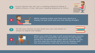 With this 6 week program we will help you improve your reading skills. Dont forget to wear the glasses given to you by your doctor. Make sure your room has the correct lighting and sit in correct posture. It is completely normal to have difficulty while reading at the beggining, your eyesight will improve as you continue with the program. Try and do the excercises at the same time each day