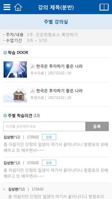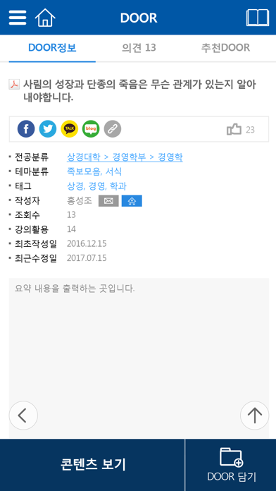• App 소개 동의대학교 DOOR(Dong-Eui Open Online Resourse) 시스템은 동의대학교 내/외부의 콘텐츠의 배포 및 공유를 활성화하고, 플립러닝 현장에서 쉽게 활용하기 위한 교육 인프라를 제공함으로써, 언제어디서나 사전/사후학습이 가능한 환경을 제공하는 시스템입니다. • 주요 기능 - DOOR 조회 - DOOR 등록/수정 - 사전/사후학습 - 모바일 퀴즈 - 커뮤니티