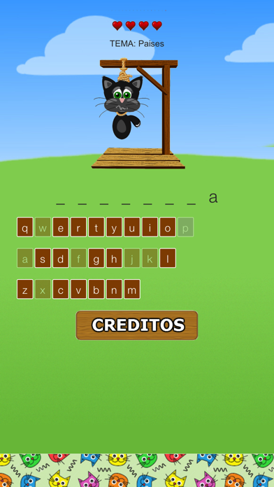 El juego de Gato Ahorcado es el clasico juego de Ahorcado, pero con un Gato Animado, a quien tendras que rescatar de la horca, para que no sea ahorcado. El juego contiene cientos de palabras fáciles en español, dividido por categorías al azar, entre las cuales están: paises, verbos, objetos, animales y otras !!