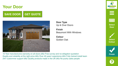 The DG Doors and Windows App allows users to actually visualise a door on their own garage or home. You can choose from a selection of garage and composite door types to build your perfect door. Once you have made your door you can then save the picture and even request a quote for the door you have built.