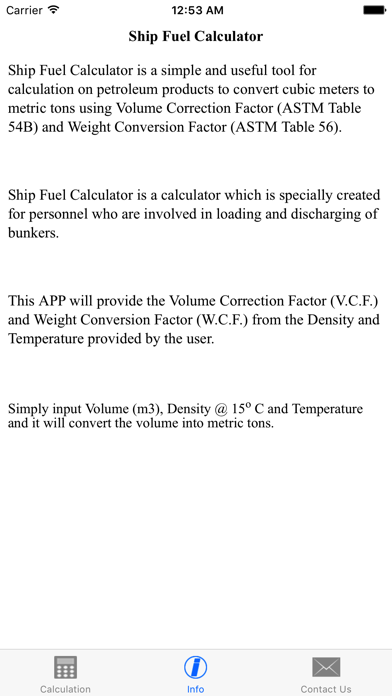 Ship Fuel Calculator is a simple and useful tool for calculation on petroleum products to convert cubic meters to metric tons using Volume Correction Factor (ASTM Table 54B) and Weight Conversion Factor (ASTM Table 56). Ship Fuel Calculator is a calculator which is specially created for personnel who are involved in loading and discharging of bunkers. This APP will provide the Volume Correction Factor (V.C.F.) and Weight Conversion Factor (W.C.F.) from the Density and Temperature provided by the user. Simply input Volume (m3), Density @ 15℃ and Temperature and it will convert the volume into metric tons.