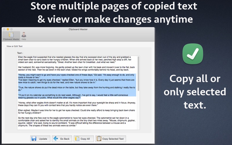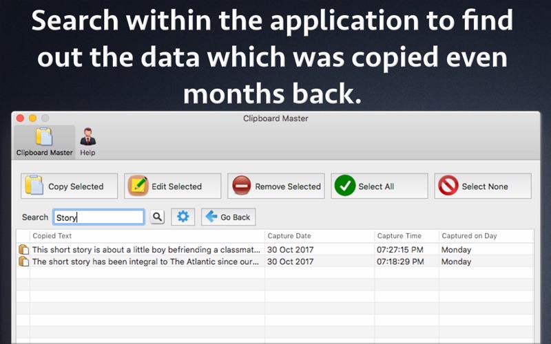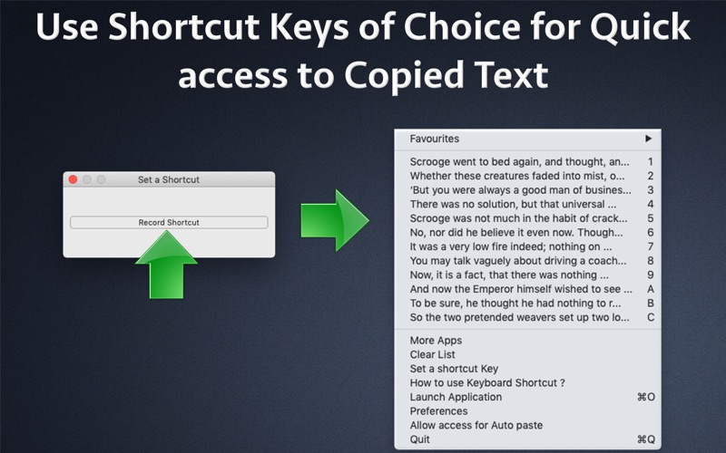 As you already know that you could only copy one text at a time. When you copy a new text, the previous copied text is lost. Many times we also miss the data that we had used a few days back like a link to website, the copied email text, a formulae of a recipe, a part of the program, a copied MS Word text and many more. The application could store thousands of copied items and also has its own Menubar Icon with "Auto Paste" functionality.This feature pastes the copied text automatically to the application on which you are working.You could also set "Favorite" clipboard items and access them easily from Menubar. The application helps to resolve this issue by storing all of the copied text. After installing this application, whenever you copy anything, the application will store it. Even if you shutdown the computer or restart it, all copied data will be retained by the application. You could store and reuse even thousands of copied text using the application.The application comes with a robust database to store thousands of copied items and provides the functionality to view, edit ,copy or search within the thousands of copied text. The application comes with two interfaces.One resides at the menubar area where you could access the most recently copied texts. ** Menubar icon with Auto paste functionality : The application also has its own menubar icon. Whenever required, you could also quickly click on the copied text in menubar. The application will automatically paste the data in the application in which you are working. ** Shortcut Keys to Launch Menubar and paste items : The application supports customised shortcut keys.For example, you could set the shortcut key to CMD +1 . When the shortcut key is pressed, the menu of recently copied items appear at the location where your mouse pointer is.Each copied item is assigned a shortcut from 1 to 9 or from A to Z. For example : To paste 2nd copied item instantly, please press the shortcut key ( For example : CMD+1 ) followed by number 2. This will paste the 2nd copied item in the copied items list to your working location. ** Assign Favourite Clipboard items : Add entries of choice to "Favourite" and access them easily from Menubar.To add an entry to Favourite, please right click on the clipboard's entry in the Main window of the application and click on "Add to Favourite". ** Search functionality : The application also comes with Search functionality. Using this, you can search for any required data & get the content that was copied even months back. From the menubar or the app's icon you could launch the main user interface where you could see all data which has been copied till now.The application stores all copied data. You could have even months of copied data inside the application. Whenever required, just open the application to see all copied texts. The application will list all data in a proper order of date and time when these were captured. Not only this, you could also modify and update the copied data inside the application. The application also allows to view and edit even multiple pages of copied text.Just double click on any entry and you will be able to see all details of the copied text. You could directly read these pages even without leaving the application.You could also select only a part of such data and reuse it anywhere by copying the selected parts only from those pages of data. Below are the features of the application: - Auto Paste - Just click on the menubar item to auto paste it on the application on which you are working. - Assign shortcut keys of choice to launch Menu of copied text. - Set Clipboard entries of choice to Favourites. - Easy to use and organize - Install the app and leave the management of all copied text to it. - Access recently copied texts from menubar icon or go to main application to see the data of months of copied text. - Unlimited copied text history retention. - Easy clipping organization and editing.
