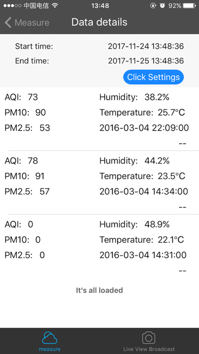 1. This App is used to connect and display the data transmitted by the hardware through Bluetooth connection, which mainly includes PM2.5, PM10, temperature, humidity and other air quality data. 2.APP can communicate with the server and upload the air quality data transmitted by the hardware. After login successfully, historical data can be obtained from the server.