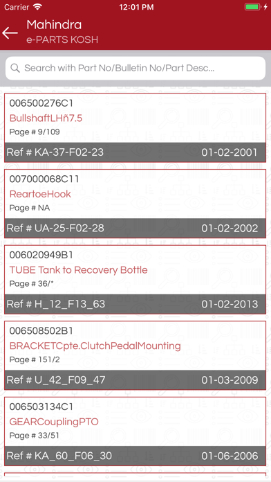 Part Number tracker is the process of tracking all part with displacement status. Based on provided advance search user can find displaced part for replacement based on customer requirements. 1. Authentication using Mahindra token authentication for Mahindra user and mobile number along with password for dealers. 2. Landing page can have option to search part (input field) using part number along with bulletin button. 3. Parts Search List can have part based on provided search query along with displaced history. User can tab on any part and redirected to respective bulletin PDF. 4. Bulletin List can have list of bulletins with search criteria’s. On tap it will redirect to respective bulletin PDF.