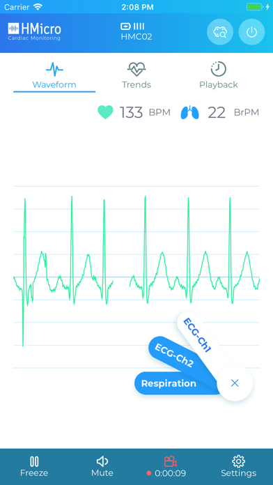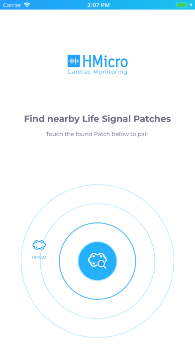 CardiacApp is a companion app to HMicro’s disposable Life Signal Patch. This app wirelessly collects data from the Life Signal Patch worn on a person’s body, and provides viewing and analysis of that person’s vital signs information. Key features are: The Life Signal Patch worn on a person’s chest wirelessly transmits the physiological data to an iPad/iPhone over a Wi-Fi network in which both the iPad/iPhone and the Life Signal Patch are client devices. The CardiacApp displays the streaming ECG and respiration waveforms of the person, along with the heart rate and respiration rate values. The user interface of the app facilitates locating and pairing with the Life Signal Patch wirelessly and securely, and provides the ability to customize the network connectivity parameters of the patch. The user can record the streaming information over a period, and later play it back.The live heart rate and respiration rate trends are also displayed. The user is informed of heart rate and respiration rate variations with alerts when they exceed or fall below user set thresholds. The live heart rate and respiration rate trends are also displayed. The user is informed of heart rate/respiration rate variation with alerts.
