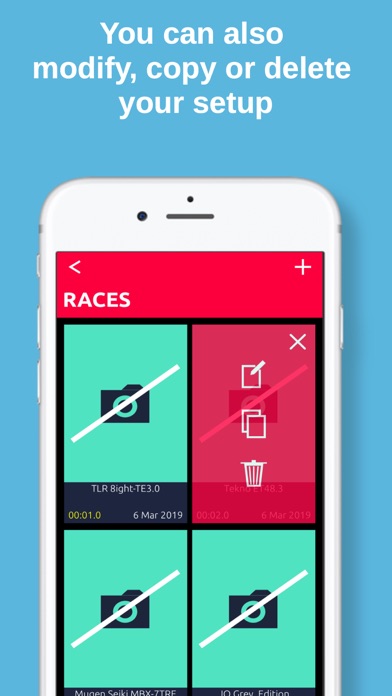 RC Car Setup 1/8 TT now for mobiles! with this app you can save the setup you use in each track, and share it!. The data you can save is divided into four sections: Race Info, Oils, Front Suspension and Rear Suspension. Race Info data: - Event - Driver - Car - Radio - Servos - Engine - Fuel - Glow plug - Clutch - Gearing - Tyres - Best time - Photo - Notes Oils data: - Preload (front and rear shocks) - Spring color (front and rear shocks) - Oil (front and rear shocks) - Piston holes (front and rear shocks) - Hole size (front and rear shocks) - Rebound (front and rear shocks) - Oil (front, center and rear diff) Suspension data: - Shock position (front and rear suspension) - Upper link position (front and rear suspension) - Lower arm position (front and rear suspension) - Ackerman (front suspension) - Upper link spacers (front suspension) - Ride height (front and rear suspension) - Camber (front and rear suspension) - Caster (front and rear suspension) - Toe (front and rear suspension) - Sway bar (front and rear suspension) - Wheel hex (front and rear suspension) - Balanced weight (front and rear suspension) - Wing (rear suspension) - Bump steer - Rear hub bush Make and models available: - Agama -> A319 / 215SV / 215 / A8EVO / A215E / A215T / A8T-Evo - Associated -> RC8B3.1 / RC8B3 / RC8B3.1E / RC8T3.1 / RC8T3.1E - Durango -> DNX8 / DEX8 / DEX8T - HB Racing -> D819 RS / D819 / E819 / D817V2 / D817 / E817V2 / D817T / E817T - Hobao -> Hyper VS / Hyper 9 / Hyper VSE / Hyper SSe / Hyper ST Pro - Hong Nor -> X3 Sabre 3.0 Evo / X3 Sabre Evo3.0 / X3 Sabre / X3 Sabre E - JQ -> Black Edition eCar / The Car 2017 / The Car 2015/16 / Grey Edition - Kyosho -> MP10 Spec A / MP10 / MP10T / MP9 TKI4 / MP9 TKI3 / MP9 / MP9E TKI4 / ST-RR Evo2 - Mugen Seiki -> MBX8 WE / MBX8Eco TE / MBX8 / MBX8T / MBX8T Eco / MBX7 / MBX8Eco / MBX-7TR / MBX-7TRE - Serpent -> Cobra SRX8 Pro / Cobra SRX8 Evo / Cobra 2.2 / Cobra SRX8E / Cobra E-Truggy - Sworkz -> S35-3 / S350 EvoII / Apollo / S35-3E, S35-T / Zeus / S35-TE - Tekno -> NB-48 2.0 / EB-48 2.0 / NB-48.4 / NB-48.3 / EB48.4 / NT-48.3 / ET48.3 - TLR -> 8ight-X Elite / 8ight-X / 8ight-XE /8ight 4.0 / 8ight 3.0 / 8ight-E4.0 / 8ight-T4.0 / 8ight-TE3.0 - Xray ->XB8´20 / XB8E´20 / XB8´19 / XB8´18 / XB8´17 / XB8E´19 / XB8E´18 / XT9 / XT8 / XT8E