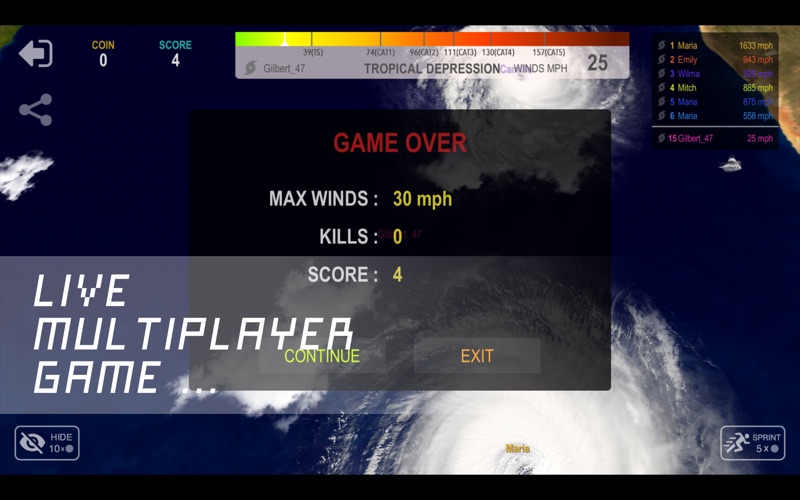 It’s just a inconspicuous cloud when you start, but you will grow into a super hurricane. In this process, you have to continue to absorb the energy on Earth. But also you face other strong competitors from around the world. They want to swallow you all the time. Your energy is from air or ocean, water, cloud and heat. To kill small hurricanes will make you grow quickly. The ideal living environment for hurricanes is on the ocean. On the land will lose energy. But if you are strong enough, Nothing can stop you! Growth System: *Clouds Increase wind speed. *Red ball (heat): Increase move speed. *Green ball (struct): Increase stability, Reduce Land or Others damage to you. *Blue ball (water): Increase mass, Faster energy absorption, but will reduce speed. * Live mode, Strong competitors from around the world * Survivor mode, Online survival mode, Everyone starts with the same windspeed. * Party mode, create your own room, invite friends to play together * Offline mode