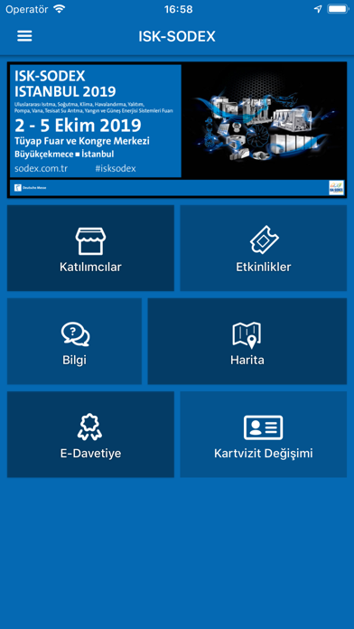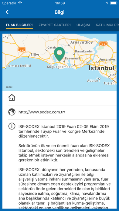 2018 Teknoloji Kaptanları Ödülleri'nde Yılın Müşteri Etkileşim Projesi ödülü ve CIO 2018 Ödülü kazanan Kapalı Alan Navigasyon Sistemli Mobil Uygulamamız yenilenen ara yüzüyle ISK-SODEX, katılımcılarına kolaylıklar sunmaya devam ediyor. 2 – 5 Ekim 2019 tarihlerinde İstanbul, Tüyap Fuar ve Kongre Merkezi’nde düzenlenen ISK-SODEX Fuarı bilgilerine erişim sağlayan uygulama, gerçek zamanlı iç mekan yönlendirme sistemi, detaylı katılımcı araması, etkinlik takvimi ve elektronik yaka kartı gibi üstün özellikler ile zahmetsiz bir fuar deneyimi sunuyor. 2018'de Apple Store'da en çok indirilen iş uygulamaları arasında yer alan uygulamayı siz de hemen indirin! Özellikler Gerçek Zamanlı İç Mekan Yönlendirme Sistemi ISK-SODEX uygulamasıyla salon ve stantların arasında kaybolmadan, gitmek istediğiniz yere ulaşın. Standını bulmak istediğiniz katılımcının adını yazın ya da katılımcıları ürün kategorilerine göre filtreleyerek sonuçlar arasından seçin. ISK-SODEX uygulaması bulunduğunuz yerden seçtiğiniz standa giden en kısa rotayı oluşturup size yönlendirsin. Aynı araba kullanırken GPS navigasyon sisteminin yaptığı gibi... Stantlar dışında restoran ve lavabo gibi ortak kullanım alanları için de yol tarifi alabilirsiniz. Fuar Hakkında Bilgi Fuar hakkında tüm önemli bilgiler artık parmaklarınızın ucunda. Fuarın açılış/kapanış saatleri, yeri, ulaşım alternatifleri, ücretsiz servis saatleri, web sitesi, kapsamı, ziyaretçi ve katılımcı profili gibi detaylara “Bilgi” bölümünden ulaşabilirsiniz. “Etkinlikler” bölümünde ise fuar süresince düzenlenecek etkinlik takvimine ve etkinlik ile ilgili tüm bilgilere göz atabilirsiniz. Profilim ve Favorilerim Fuara ücretsiz girmek ve sizin için özelleştirilmiş bir fuar deneyimi yaşamak için bireysel profilinizi oluşturun. LinkedIn hesabınızı kullanarak ya da web sitemizden gerçekleştirmiş olduğunuz online kayıt bilgilerinizle profilinizi kolayca oluşturabilirsiniz. Katılımcı firmalar, ürünler ve etkinlikler içinden favorilerinizi belirleyebilir ve fuar deneyiminizi daha etkin hale getirecek kişiselleştirilmiş listeler oluşturabilirsiniz. E-Davetiye Uygulama içindeki kayıt formunu doldurarak ücretsiz e-davetiyenizi alabilirsiniz. Daha önceden kayıt yaptıysanız fuara giriş yapmak için kullanabileceğiniz barkodu bu bölümde görüntüleyebilir, beklemeden fuar alanına giriş yapabilirsiniz.