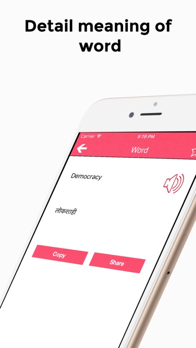 Easy to search Marathi meaning of English word. Copy, Share, Favourite or Listen words. Play quiz and improve knowledge.. We're having collection of more than 50,000 words. Application Features: - Search any words and see Marathi Translation - No internet connection required - Add words to Favourites - Display History of all searched words - Copy word - Add to Favourites - Play quiz. Select answer for multiple choice and check knowledge - Copy Hindi Translation to paste board and paste through application - Share word via Facebook / Twitter / Whatsapp - Send word via Email / Facebook