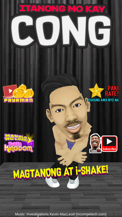 Wazzup mga paa! Nagdududa ka ba sa iyong desisyon sa buhay? May agam agam ka ba? Oh sadyang wala ka lang talagang sariling paninindigan? Walang problema mga paa! Itanong mo kay Cong at sya ang mag dedesisyon para sa inyo! PAAWER! Ang iTanong Mo Kay Cong ay ang official game ni CongTV. PAANO MAGLARO? 1. Magtanong ng mga katanungang kayang sagutin ng OO at HINDI 2. i-SHAKE/KALUGIN ang inyong PHONE para magpatalbog talbog si Cong 3. Itigil ang pag shake at pakinggan ang kasagutan ni Cong sa iyong tanong! HALIMBAWA NG MGA TANONG NA KAYANG SAGUTIN NG OO at HINDI: Pogi ba ako? Kuripot ba ang ka date ko? Kakaliwa ba ako? SALAMAT! PAAWER!! ============== Like and follow our FB page: www.fb.com/itanongmokaycong www.fb.com/ranidagames Subscribe to CongTV's YouTube Channel : https://www.youtube.com/user/lincolnvelasquez