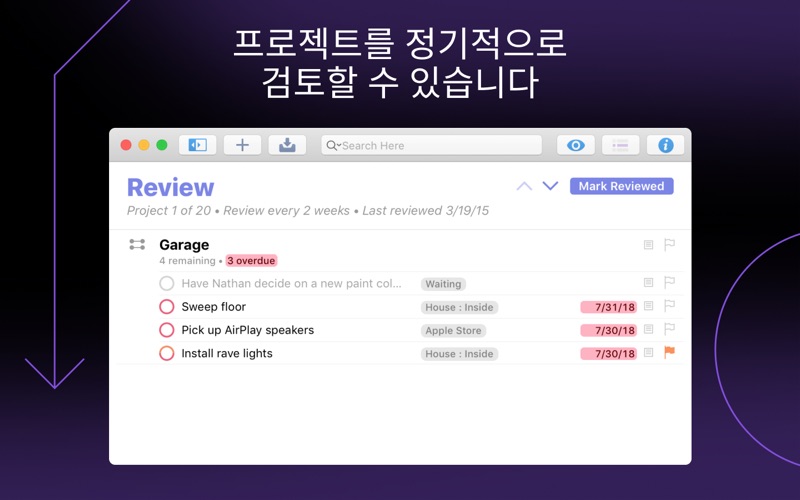 2주간 무료 사용! OmniFocus Standard 및 Pro는 앱 내 구입으로 제공되며, Mac App Store에서 이전 버전의 Mac용 OmniFocus를 구매한 사용자에게 할인 혜택이 제공됩니다. 또는 OmniFocus 구독 비용만으로 iOS, Mac 및 웹용 OmniFocus를 얻을 수 있습니다. 자세한 내용을 보려면 앱을 다운로드하십시오. OmniFocus를 사용하면 일상적인 업무 효율을 크게 높일 수 있습니다. 프로젝트 및 작업을 만들고, 이를 태그로 정리하고, 지금 당장 수행할 수 있는 작업에 집중하여, 업무를 효율적으로 처리할 수 있습니다. 신뢰할 수 있는 작업 관리 앱으로 높게 평가되고 있는 OmniFocus는 올해로 벌써 10주년이 되었습니다. OmniFocus를 사용하면 자신의 Mac에 비교할 수 없는 성능과 유연성을 제공하고, 자신이 원하는 방식으로 작업을 쉽게 수행할 수 있습니다. OmniFocus를 사용하면 바쁜 일상에서 벌어지는 모든 일들을 관리할 수 있습니다. 프로젝트를 사용해서 작업들을 자연스럽게 관리하고, 태그를 통해 프로젝트를 쉽게 정리할 수 있습니다. 이동 중에도 작업을 쉽게 입력하고, 여유가 있을 때 이를 처리할 수 있습니다. 작업과 캘린더 이벤트가 모두 표시되는 예측 보기를 누르면 그날의 일정을 쉽게 파악할 수 있습니다. 검토 개요에서는 프로젝트와 작업의 진행 상태를 관리할 수 있습니다. 그런 다음 무료로 제공되는 동기화 시스템을 활용해서 모든 Mac에서 데이터를 동일하게 업데이트할 수 있습니다. (별도로 제공되는 iOS 및 웹용 OmniFocus도 지원됩니다.) 데이터가 암호화되어 클라우드에서도 안전하게 사용할 수 있습니다. STANDARD 기능(앱 내 구입을 통해 제공) • 신규: 태그는 강력한 구성 도구입니다. 사람, 에너지 수준, 우선 순위, 위치 등 다양한 기준에 따라 태그를 만들 수 있습니다. • 신규: 예측 보기에는 작업 및 캘린더 이벤트가 순서대로 표시되므로, 오늘 처리해야 할 항목을 보다 쉽게 확인할 수 있습니다. • 신규: 향상된 반복 작업 기능으로 더 쉽게 설정하고, 월의 첫 번째 주와 같이 실제 상황에 맞게 예제를 사용할 수 있습니다. • 신규: 현대적이고, 새롭지만 친숙한 디자인으로 자신의 콘텐츠에만 집중할 수 있게 해줍니다. • 수신함에서는 작업을 빠르게 추가하고, 필요할 때 저장하거나, 나중에 항목을 구성할 수도 있습니다. • 동기화는 서버 또는 사용자 장치 등 어디에 저장되든 데이터가 안전하도록 포괄적인 암호화 기능을 지원합니다. • 작업에 메모를 첨부하여 필요한 정보를 추가할 수 있습니다. • 첨부 파일 - 그래픽, 비디오, 오디오 등 원하는 무엇이든 자신의 작업에 다양하게 추가할 수 있습니다. • 보기 옵션을 사용하면 표시할 항목과 작업 필터링 방식을 결정하여 각 개요를 사용자 정의할 수 있습니다. • 검토 개요에서는 프로젝트 및 작업을 원하는 대로 구성하고 추적할 수 있습니다. • OmniFocus Mail Drop을 사용하면 이메일을 통해 작업을 추가하고 IFTTT 및 Zapier와 같은 서비스를 사용할 수 있습니다(무료 동기화 서버를 사용하는 경우). • 오늘 위젯에서는 앱을 열지 않아도 중요한 작업을 쉽게 확인할 수 있습니다. • TaskPaper 텍스트 및 omnifocus:///add 및 /paste 지원으로 URL 사용을 자동화할 수 있습니다. Pro는 OmniFocus에서 보다 강력한 기능을 제공합니다. PRO 기능(앱 내 구입을 통해 제공) • 사용자 정의 개요를 통해 프로젝트 및 태그를 필터링 및 그룹화하여 데이터를 새로운 방식으로 표시할 수 있습니다. 신규: 더 강력한 기능을 제공하는 필터링 규칙을 더 쉽게 사용할 수 있으며, "모두", "임의" 및 "없음"을 사용해서 규칙을 조합할 수 있습니다. 이미지를 선택해서 사용자 정의 개요 아이콘으로 사용할 수도 있고, 사용자 정의 틴트 색상을 입힐 수도 있습니다. • 신규: 오늘 예측에는 특정 태그가 지정된 항목을 포함할 수 있으며, 원하는 방식으로 작업을 재정렬하여, 그날의 업무를 보다 효과적으로 계획할 수 있습니다. • 사용자 정의 가능한 사이드 막대를 통해 원하는 방식대로 개요를 구성하고 빠르게 액세스할 수 있습니다. • 오늘 위젯에서는 선택한 개요가 알림 센터에 표시되도록 설정할 수 있습니다. • AppleScript 지원으로 Apple의 Mac 스크립팅 언어를 사용해서 자동화 기능을 활용할 수 있습니다. 지금 바로 OmniFocus를 다운로드하고 무료 평가를 시작하십시오! 이 앱에는 설명서가 포함되어 있으며, 웹 사이트에서 더 많은 문서를 확인할 수 있습니다. 지원 The Omni Group 지원 센터에서는 언제라도 귀하의 피드백 또는 질문을 기다리고 있습니다! 이메일 [email protected]이나 전화 1-800-315-6664 또는 +1-206-523-4152, Twitter(@omnifocus)로 연락하시기 바랍니다. Subscription Terms of Service: https://www.omnigroup.com/legal