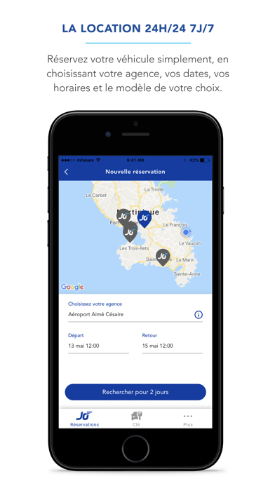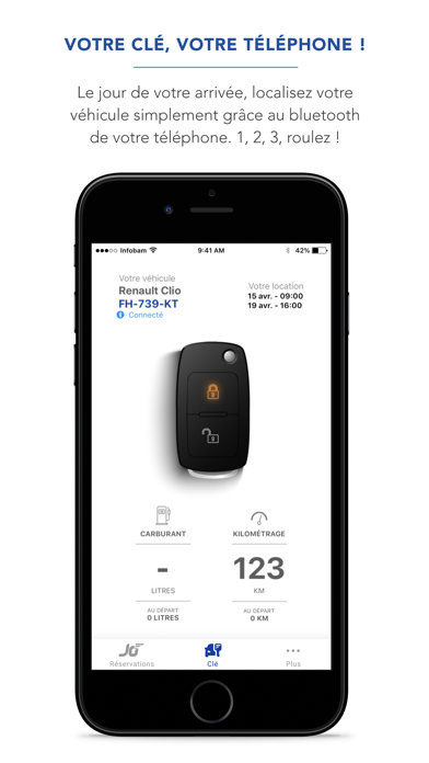 Réservez en 1 clic : - Choisissez le territoire sur lequel vous souhaitez effectuer votre location (Martinique, Guadeloupe, Guyane, Réunion). - Réservez votre véhicule parmi une gamme de véhicules neufs, de qualités et aux grandes finitions. Simplifiez-vous la vie : - Renseignez vos informations personnelles et transmettez votre permis de conduire. N’attendez-plus : - Rendez-vous facilement à votre véhicule grâce au système de localisation de votre smartphone. Gardez confiance : - Effectuez votre état des lieux en toute simplicité grâce à l’appareil photo de votre smartphone, accessible directement depuis l’application. Soyez émerveillé ! : - Ouvrez votre véhicule avec la clef virtuelle sur l’écran de votre smartphone. - Roulez ! Attention : l’utilisation de Jo nécessite une connexion internet fonctionnelle pour le téléchargement de votre clef virtuelle et la transmission de vos états des lieux. Si, lors de votre arrivée, votre connexion internet n’est pas disponible, rendez-vous dans le hall de l’aéroport et connectez votre téléphone au wifi de l’aéroport pour télécharger votre clef ! Un problème de batterie ? Tous les véhicules Jo sont équipés de cartes RFID sur laquelle vous pouvez très facilement transférer votre clef virtuelle. Celle-ci vous servira alors à verrouiller et déverrouiller votre véhicule pendant la durée de votre location. Vous pourrez à tout moment rebasculer la clef sur votre téléphone.