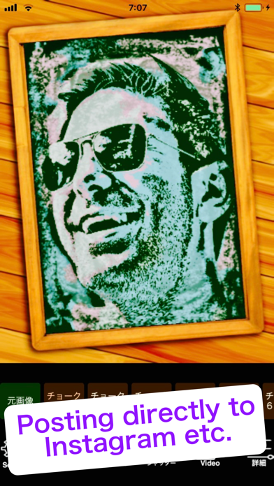 This is application to convert a photograph into a chalk art painting in real time. This app changes any photograph into the chalk image which seemed to be drawn on the blackboard instantly. The three ways of color pattern , only white , three colors of blue , red , white and the natural color can be chosen . I prepared 14 original filters in total by changing the combination of extracting method of lines and density of shadow . Because the images from device camera are directly effected , you can press the shutter button while confirming the deformed image . You can express a more delicate touch by operating three sliders prepared for each filter . With third slider you can choose one from many kinds of blackboard . The processed image can be stored in an album and reused again and again. When you want to deform a profile photograph in an illustration style or when you want to upload a strange photograph in Instagram or another SNS , please use it steadily. 14 effects : Chalk 1 Chalk 2 Chalk 3 Chalk 4 Chalk 5 Chalk 6 Chalk 7 Chalk 8 Chalk 9 Chalk 10 Chalk 11 Chalk 12 Chalk 13 Chalk 14 Features : 1 Real-time generation of effected image through camera 2 Real-time edition of photos in album with effects 3 14 original artistic effects 4 Three slider controllers per each effect 5 Real-time shooting with camera 6 Saving effected images into camera roll 7 Switch button for back and front camera 8 Zooming in and out by pinching 9 Supporting horizontal placement of iPhone and iPad 10 Changing the transparency of the slider controllers 11 Changing the size down level when loading photos from an album 12 Sharing processed images with friends by SNS 13 Keeping temporary value of slider when filter button changed 14 Back to the default value of slider when button named Original pushed 15 Posting directly to Instagram ,Facebook etc. 16 Saving screen into album as a video clip (iOS 11 over)
