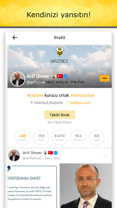İster kişileri ister 24 kategoriden dilediğini takip ederek güncel kal, olanı biteni yakından izle. Haberden magazine, spordan siyasete kadar çevrende ve dünyada olan gelişmeleri takip edip gündemin bir parçası ol. Dilersen sadece takip et dilersen takip ile yetinme sen de yaz, sesini duyur. Üstelik sadece beğenmek zorunda değilsin, beğenmeyerek de kendini ifade edebilirsin. Gönderilerin senin kontrolünde; Kimsenin keyfini kaçırmasına izin vermeden yoruma kapatarak metin, resim ve 3 dakikaya kadar yükleyebileceğin video ile seni tam olarak ifade eden gönderini oluşturabilirsin. Sosyal medyanı istediğin gibi kişiselleştir; Kişilerle beraber 24 kategoriden de ilgini çekenleri takibe alarak kendine özel akış sayfası oluştur, güncel kal. Paylaşımlarını ilgili kategoriyi seçerek yaparak seni takip etmeyen ama o kategoriye abone olanlara sesini duyurup, etkileşime geç. Ya da sadece seni takip edenlerle iletişimde kal. Sen nasıl istersen o şekle giren sosyal medya YazBee. Sosyal medyanın yeni hali YazBee, sen de yaz, oluşan sinerjide payın olsun.