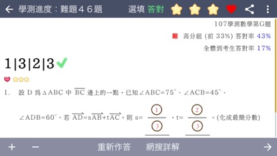 ・免費預覽所有試題。(已更新至107學測與107指考) ・免費贈送106學測與106指考共兩份試題組合包。 ・多樣化選題角度,以最快方式找出你想做的題目: (1)圖表題。 (2)題組題。 (3)難題:高分組(前33%)答對率小於50%。 (4)高難題:高分組(前33%)答對率小於40%。 (5)超難題:高分組(前33%)答對率小於20%。 (6)必對題:全體到考生答對率大於50%。 (7)智慧導題:依歷屆出題比例與導題設定自動餵題。 (8)指定章節:依課綱章節找題目。 (9)弱點加強:從答錯題目所對應的課綱章節再找同章節題目。 (10)歷屆試題:年度整份試題,可計時模擬考。 (11)每道題目可標註星號與最愛,以自己的方式分類,便於復習時更快找出重點題目。 ・題目難易度採用大考中心官方統計數據:答對率及鑑別指數表, 可自行設定指標,增減篩選題數。 ・即時問答:每做一題就可對答案,充份運用零碎時間,提昇學習效果。 ・網搜詳解:帶入試題年度及題號,透過瀏覽器至網路上搜尋詳解。 ・定時提醒測驗:每天提醒測驗,定時不漏接,有助於轉化短期強記為中長期記憶。 ・我的進度:記錄答題結果,從多樣化選題角度分析進度,抓住再多對一題的契機! ・試題分享:可將重要或有疑問的題目透過電子郵件或 LINE 與好友分享討論。 ・收錄 學測 數學科題庫統計: (1)收錄範圍:96學年度~最新107學年度官方試題選擇題,共12年度。 (2)總題數:240題。 (3)圖表題:37題。 (4)題組題:0題。 (5)難題:46題,佔比19%。 (6)高難題:29題,佔比12%。 (7)超難題:3題,佔比1%。 (8)必對題:72題,佔比30%。 ・收錄 指考 數學科題庫統計: (1)收錄範圍:96學年度~最新107學年度官方試題選擇題,共12年度。 (2)總題數:299題。 (3)圖表題:51題。 (4)題組題:0題。 (5)難題:23題,佔比8%。 (6)高難題:9題,佔比3%。 (7)超難題:2題,佔比1%。 (8)必對題:145題,佔比48%。 ・學測與指考試題圖文內容及各題答對率統計資料來源:大學入學考試中心。 本 APP 是考試王必備利器!別人有,你不可以沒有!