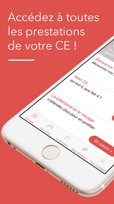 ACCEDEZ A TOUTES LES PRESTATIONS DU CE ! Pour vos sorties de dernière minute, des vacances en famille ou pour Noël …. Profitez des avantages de votre comité d'entreprise quand vous en avez VRAIMENT besoin ;) Sur l'application mobile du CE : - recevez des alertes sur nos actualités du CE : nouvelles activités, évènements... - commandez ou vous inscrire à toutes nos prestations - accédez au suivi de vos commandes et inscriptions en un clin d'œil - récupérez vos e-billets en 1 clic SOYEZ LES 1ERS INFORMES ! Pour tirer le meilleur parti de votre application, acceptez la réception des notifications sur votre appareil. Grâce à elles, le CE communique avec vous. Afin de vous laisser le plus large choix, vous pouvez depuis la page « nous contacter », envoyer un e-mail ou appeler directement votre CE pour toutes questions. L’ACTUALITE DE VOTRE CE EN TEMPS REEL Vous souhaitez être informés en temps réel sur les actions de votre CE et les nouvelles offres en ligne. Les rubriques « A la une » et « vos infos », vous permettent d’accéder aux comptes-rendus de votre CE, à son agenda et à toutes les nouveautés et actualités du bureau. DES AVANTAGES TOUTE L’ANNEE Cette application vous permet de profiter toute l’année de tarifs réduits sur les places de cinéma dans plus de 330 salles en France, les places de concerts, de spectacles et de nombreuses autres idées sorties sur TOUTE LA FRANCE. Nous avons pensé cette application pour vous. Dites-nous ce que vous en pensez : vos avis, vos idées, vos suggestions d'amélioration nous aideront à la faire évoluer. Pour cela écrivez-nous à [email protected] Vous aimez l'appli et avez apprécié votre expérience ? Faites-le savoir aux autres utilisateurs en laissant une note ainsi qu’un commentaire.