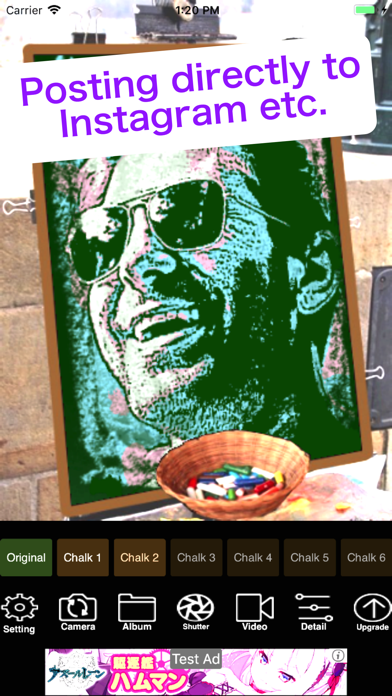 This is application to convert a photograph into a chalk art painting in real time. This app changes any photograph into the chalk image which seemed to be drawn on the blackboard instantly. The three ways of color pattern , only white , three colors of blue , red , white and the natural color can be chosen . I prepared 14 original filters in total by changing the combination of extracting method of lines and density of shadow . Because the images from device camera are directly effected , you can press the shutter button while confirming the deformed image . You can express a more delicate touch by operating three sliders prepared for each filter . With third slider you can choose one from many kinds of blackboard . The processed image can be stored in an album and reused again and again. When you want to deform a profile photograph in an illustration style or when you want to upload a strange photograph in Instagram or another SNS , please use it steadily. 14 effects : Chalk 1 Chalk 2 Chalk 3 Chalk 4 Chalk 5 Chalk 6 Chalk 7 Chalk 8 Chalk 9 Chalk 10 Chalk 11 Chalk 12 Chalk 13 Chalk 14 Features : 1 Real-time generation of effected image through camera 2 Real-time edition of photos in album with effects 3 14 original artistic effects 4 Three slider controllers per each effect 5 Real-time shooting with camera 6 Saving effected images into camera roll 7 Switch button for back and front camera 8 Zooming in and out by pinching 9 Supporting horizontal placement of iPhone and iPad 10 Changing the transparency of the slider controllers 11 Changing the size down level when loading photos from an album 12 Sharing processed images with friends by SNS