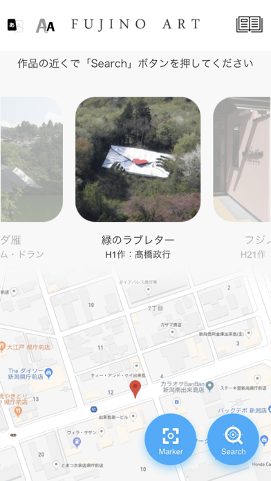 このアプリは、通称「芸術の道」沿いに設置されている28点の作品を紹介しており、それぞれの作品が織りなす様々なメッセージを受け取ることができます。また、GPS機能により、現在地周辺の作品も探すことができます。 ぜひ「Fujino ART」アプリをお楽しみください。 【操作方法】 ・「Search」ボタンでスマートフォンのGPS機能から現在地を取得して、ユーザーの近くの作品を検索することができます。 ・「Marker」ボタンをタップするとカメラが起動します。藤野駅で配布されているパンフレットの作品の画像にカメラをかざすとその作品の詳細情報を見ることができます。 【推奨端末】 iOS9.0以上搭載のiPhone6以上のiPhone端末