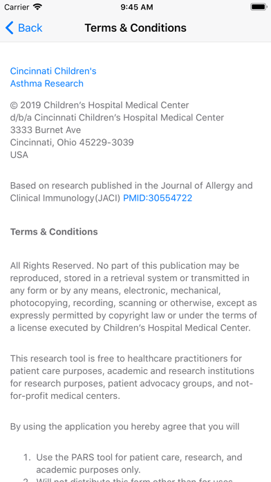 The Pediatric Asthma Risk Score (PARS) is the first continuous scoring system for predicting asthma risk in young children. Based on research published in the Journal of Allergy and Clinical Immunology(JACI) PMID:30554722 PARS is superior to the existing Asthma Predictive Index (API) with an 11% increase in sensitivity. By answering just 6 simple questions about eczema, wheezing, race, sensitization status and parental asthma history, families and clinicians are able to determine a child’s personal risk of developing asthma. App Created by Gregory Hill at Cincinnati Children's Hospital Medical Center Title: A Pediatric Asthma Risk Score (PARS) to Better Predict Asthma Development in Young Children Publication Authors: Jocelyn M Biagini Myers PhD[1,5], Eric Schauberger DO, PhD[1,2], Hua He MS[3], Lisa J Martin PhD[3,5], John Kroner MS[1], Gregory M Hill BS[1], Patrick H. Ryan PhD[4,5], Grace K LeMasters PhD, MSN[6], David I Bernstein MD, MS[6,7], James E Lockey MD[6], S. Hasan Arshad, DM, FRCP[8], Ramesh Kurukulaaratchy, DM[8], Gurjit K Khurana Hershey MD, PhD[1,5] Divisions of [1]Asthma Research, [2]Allergy and Immunology, [3]Human Genetics, [4]Biostatistics and Epidemiology, Cincinnati Children’s Hospital Medical Center, Cincinnati, Ohio, USA. [5]Department of Pediatrics, [6]Department of Environmental Health and [7]Department of Internal Medicine, University of Cincinnati, Cincinnati, Ohio, USA, [8]David Hide Asthma & Allergy Research Centre, St. Mary’s Hospital, Newport, Isle of Wight, UK