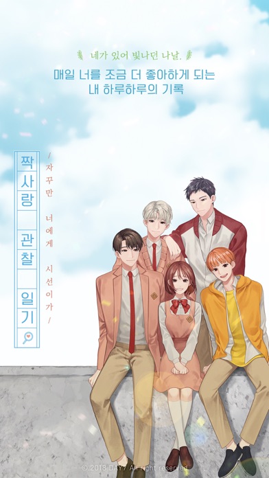 너를 좋아하는 마음이 매일 커져서 이렇게 하루를 쓰지 않으면 답답한 마음이 뻥 터져버릴 것 같아. 내 일기에는 네 얘기 밖에 없을만큼 나는 널 생각하고 너를 하루하루 더 좋아하게 되는데 너는 아무것도 모르지? 설레는 나처럼 너도 나를 좋아한다면 좋을텐데…. "누나! 우린 운명이예요!" 짝사랑 후보 1. 귀여운 운명론자 '이도윤' "나도 꽃처럼 예뻐해주면 좋겠다." 짝사랑 후보 2. 뭐든 잘하는 우주 엄친아 '서우주' "...가지마." 짝사랑 후보 3. 다정한 과묵러 '강선호' "하루가 끝나면 네가 생각나." 짝사랑 후보 4. 재수탱이+귀여움= '차현재' 나의 가장 특별한 '짝사랑' . . . 18살, 가을 너를 만나 내 '짝사랑 관찰일기'가 처음으로 펼쳐졌다. 아직도 나는 너를 보면 설레. *** 게임 관련 문의는 휴대폰 기종 및 상황을 기재하시어 [email protected] 으로 메일을 보내주세요. 개인정보취급방침 및 서비스이용약관: http://admin.becomead.com/provision/provision.php?lang=ko 개발사 홈페이지: www.day7games.com 개발자 연락처 : 010-4182-2221 ---- 개발자 연락처 : +821041822221 서울시 마포구 양화로 12길 16 105-87-87360 제 2016-서울마포-0320호