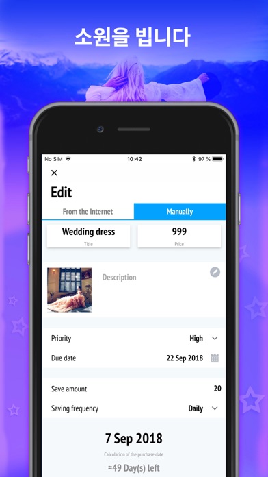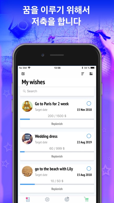 쇼핑을 좋아하는데 구입을 항상 보류하는 사람들을 위한 훌륭한 앱입니다. Wishies 앱은 당신을 정말 도와주는 것: 1. 소원 목록을 만듭니다. 그냥 링크를 추가하고 언제나 사고 싶은 물건에 대한 정보를 가질 것입니다. 자신 꿈의 휴가를 계획하거나 자신이 달성하고 싶은 것을 저장합니다. 2. 정리를 잘하게 됩니다. 오늘부터 저축을 시작합니다. 처음에는 비용을 절감하는 것인데 그 다음에는 기회가 더 많아질 것입니다. 3. 자신 꿈이 실현되는 것을 봅니다. 우선 사항과 시각적 다이어그램으로 자신 업적을 추적할 기회가 있습니다. 그 외에 앱은 자신 소원에 대해서 항상 상기시킬 것입니다. 저장하고 싶은 꿈이 벌써 있습니까? 이 유익한 앱을 스마트폰에 다운로드하고 쇼핑을 하기 위한 돈이 있을 것입니다!
