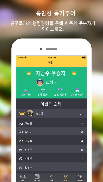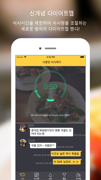 10min diet는 식사시간을 제한해서 식사량을 조절하는 새로운 개념의 다이어트 앱입니다. 식사량 조절때문에 매번 다이어트에 실패했다면 식사시간을 줄여보세요. 식탁에 앉아 앱을 켜면 자동으로 10분후에 알람이 울려 식사를 마칠 수 있도록 도와줍니다. 또한 10min diet는 다음과 같은 다양한 부가기능을 제공합니다. [사진공유] 식탁에 올려진 음식을 사진을 찍어 친구들에게 공유해보세요. 아침, 점심, 저녁으로 차려지는 식단을 사진으로 남기고 이를 통해 무엇을 얼마나 먹고있는지 모니터링하고 자신의 식단을 친구들의 식단과 비교해보세요. [채팅] 식사중인 친구에게 힘내라고 응원의 메세지를 보내주세요. 친구들의 응원이 힘이되어 보다 적은양의 음식을 먹도록 도와줍니다. 또한 서로의 식단에 대한 궁금증이나 솔직한 의견을 교환할 수도 있습니다. [주간랭킹] 한주동안 수집된 데이터를 통해 친구들의 식사패턴과 다이어트 성공률 등을 공유하고 자신의 랭킹을 확인할수 있습니다. 누가 가장 많이 다이어트에 성공하였는지 누가 가장 많은 식사를 했는지 체크함으로서 다이어트에 대한 동기유발이 가능합니다. [뉴스피드] 실시간으로 친구들의 식사상황을 보고받고 친구들의 상태를 확인하세요. 오늘저녁 친구들은 무엇을 먹고 있는지 궁금하다면 10min diet가 알려드릴겁니다. 야식으로 치킨과 피자를 먹는 친구가 있다면 잔소리를 퍼부어 주세요. [다이어트 캘린더] 다이어트 캘린더는 월간보기를 통해 매일매일의 식사횟수와 다이어트 성공여부를 한눈에 파악할 수 있도록 도와줍니다. 개별 일자에 세부내역은 통해 그날의 식단과 식사량을 확인하세요.