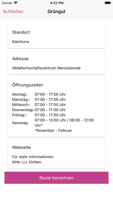 Die Abfall App des Landkreises Nordhausen erinnert Sie kostenlos und rechtzeitig an alle Termine rund um den Abfall. Die Auswahl Ihres Wohnortes erfolgt in wenigen Schritten. Eine Vorschlagsliste unterstützt Sie bei der richtigen Auswahl der Ortsdaten. Durch eine übersichtliche Kalenderdarstellung in Verbindung mit einer einfach einzurichtenden Erinnerungsfunktion verpassen Sie nie wieder einen Abfuhrtermin. Eine erweiterte Legende bietet alle weiteren Zusatzinformationen. Funktionen: - Darstellung der Entsorgungstermine als Wochenansicht, Monatsansicht oder Liste - Terminerinnerung über die lokale Benachrichtigungsfunktion Ihres Smartphones - Einfache Auswahl je Ort mit unterstützenden Filterfunktionen - Dynamische Legende für Sonderentsorgungen mit Standorten und Uhrzeit - Abfall-ABC - Exportfunktion für Entsorgungstermine - Alle Daten sind auch Offline verfügbar - Push-Mitteilungen bei Störungen im Abfuhrbetrieb - Möglichkeit mehrere Adressen auszuwählen (Multiadressauswahl) - Geolokation für die Standortanzeige von Wertstoffhöfen und Stellplätzen des Schadstoffmobils